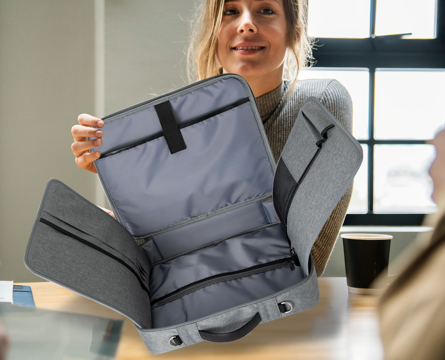 The office handbag is made of waterproof and environment-friendly material RPET, which is wear-resistant, tear resistant, with good hand feel, light weight, stable color, and easy to clean. The faux leather handle is comfortable and of high quality, and the high-grade gray texture is timeless.